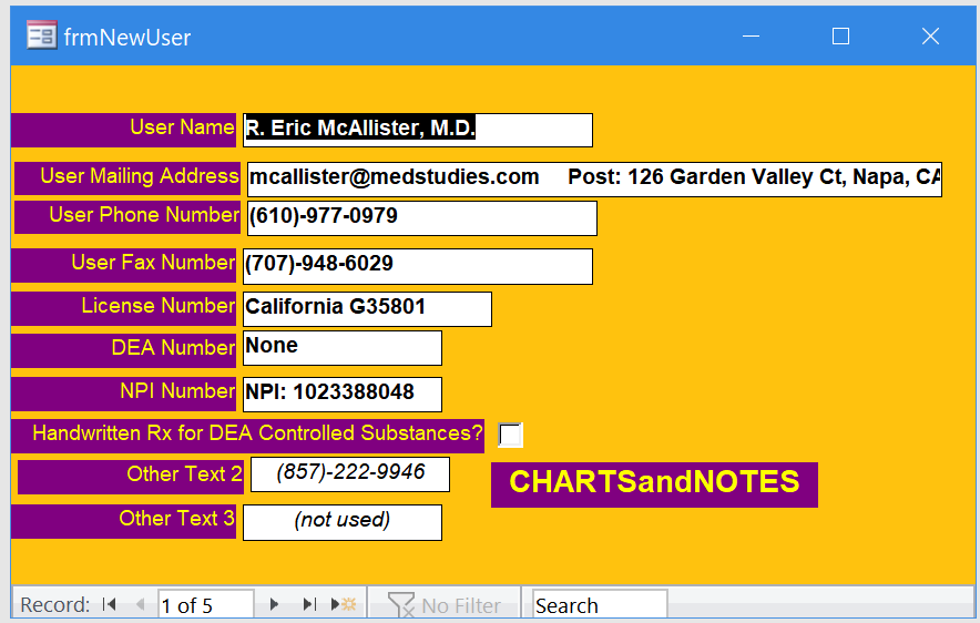 Once you have found the correct address and clicked on the “Open the E.M.R.” button, the following form (“frmUserData“) will appear: