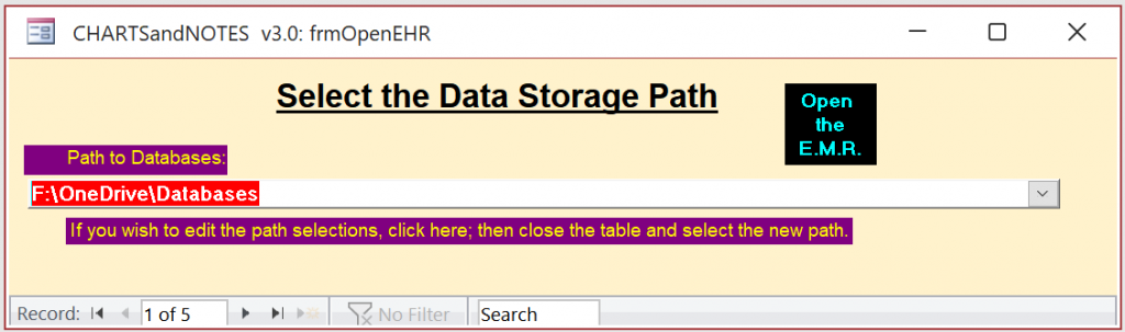 Now start the program, by opening the file CHARTSandNOTES_v5.accdb. That will open MS Access, either by using the free runtime version that comes with the program, or alternatively by using your own version (which you have purchased separately). You will be presented with the new form frmOpenEHR.