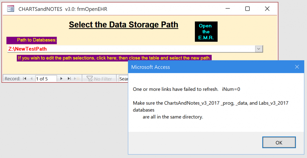 Press “OK” on that message, and then open the “Path to Databases” combobox (click the down arrow at the right of the box containing the path name). A drop-down list will appear. If you see what you already know is the correct path on this machine, select it, and try “Open the EMR” again. If the failure message does not appear, you are ready to move on.