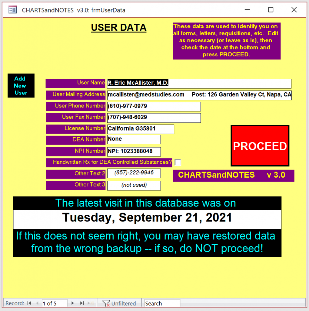 Note the very large label marked “PROCEED“. If and only if the date shown as “the latest visit in this database” appears to be correct, click on this label. If that date does not seem correct, you may be restoring from an outdated dataset, and you may lose some data! [If data is lost, there is a reasonable chance of regaining it, if you can also open the correct database before anything in it has been changed. It can take a lot of work, since it requires placing copies of the program, data, and labs databases in a different folder, opening the program in both folders, and then painstaking copying each field of each mising record from one window to another. If you find yourself in this position, proceed very carefully!]